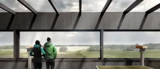 The new museum, Borgring Viking Fortress, is designed with due respect for the historic castle, which remains the absolute diamond of the exhibition. The museum's location offers visitors a magnificent view of Harald Bluetooth's Viking landscape, while the large openings in the north-facing facade create a visual connection to the fortress.