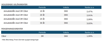 Rentegraferne viser udviklingen i hhv. 3M CIBOR- og DKK-renteswaps med fast rente. En renteswap med fast rente er en aftale mellem to parter, hvor man udveksler CIBOR-rente med fast rente over en given tidshorisont over 1 år. Renteswaps er meget likvide og er almindeligt anvendt i det danske rentemarked.