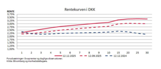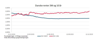 Forventningen blandt de danske banker er, at renteforskellen til ECB på 0,40 % ikke bliver ændret i 2026, og derfor ventes Nationalbankens indlånsrente at forblive stabil på 1,60%. DKK har været svækket over for EUR i de seneste måneder, men det har ikke fået Nationalbanken til at støtteopkøbe DKK i markedet. Bankøkonomerne forventer, at DKK fortsat vil være stabil over for EUR i 2026 og ser derfor ikke for sig, at Nationalbanken bliver aktiv på valutamarkedet. Analytikerne forventer desuden, at de danske markedsrenter vil følge udviklingen i eurozonen.