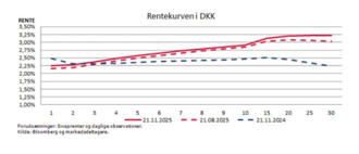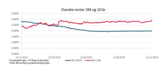 De seneste uger har der været forholdsvis stille på de internationale kapitalmarkeder, dog med en tendens til svagt stigende renter. En af årsagerne til den rolige udvikling har været nedlukningen af den offentlige sektor i USA, der bl.a. betød, at der ikke kunne offentliggøres flere væsentlige nøgletal som ledighedstal og inflationstal. Markedet har måttet nøjes med mindre betydningsfulde økonomiske nøgletal publiceret af private analyseinstitutter. I markedet hersker der usikkerhed, om den amerikanske centralbank (FED) vil sænke renten endnu engang i år på deres møde den 10. december med 0,25 %-points til 3,50-3,75 %. Meget vil afhænge af udviklingen i de toneangivne nøgletal, der vil blive offentliggjort i løbet af de næste par uger efter den offentlige sektor er genåbnet. Blandt de offentliggjorte nøgletal var ledigheden for september, som viste et blandet billede for jobmarkedet. Ledighedstal for oktober og november bliver først publiceret efter FEDs møde, så usikkerheden om renten er ikke blevet mindre efter tallene for september.